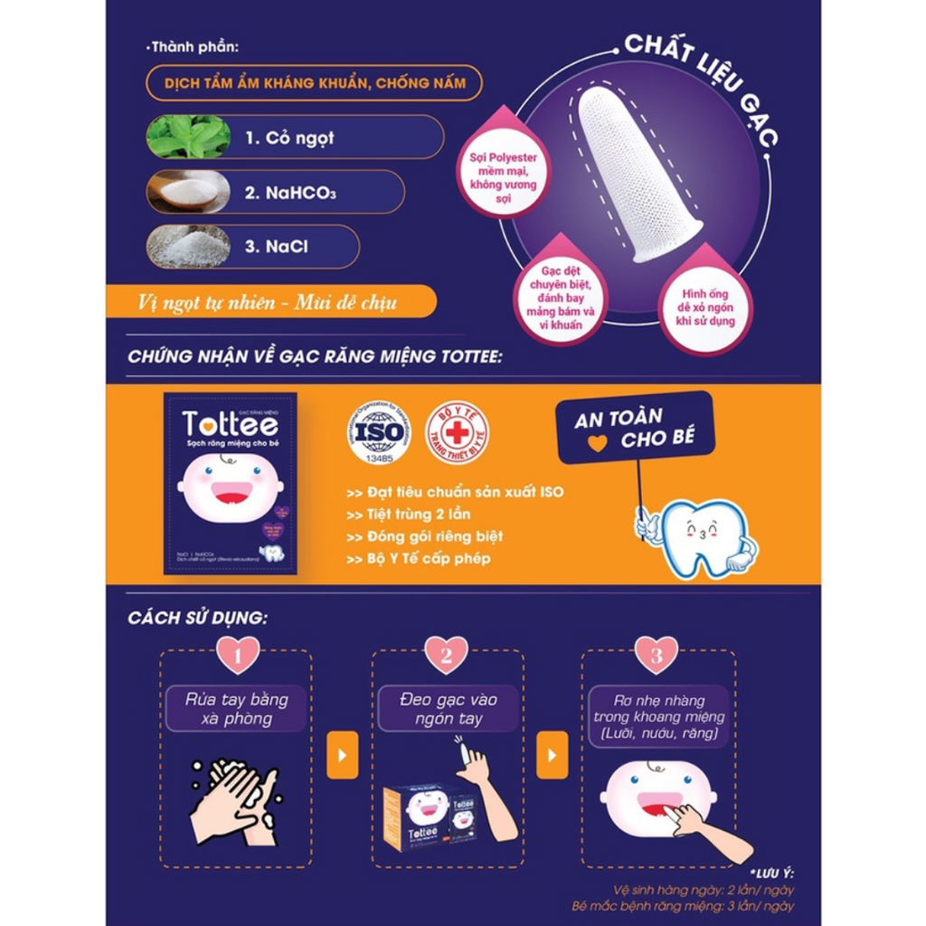 - Gạc rơ lưỡi Tottee được KẾT HỢP BỘ 3 thành phần đã chứng minh an toàn, lành tính với trẻ nhỏ, đó là: