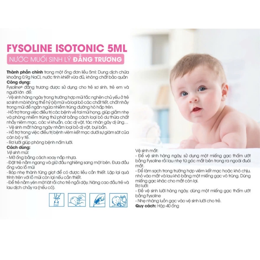 Nước muối sinh lý Fysoline được sử dụng cho trẻ sơ sinh, trẻ em và người lớn để: